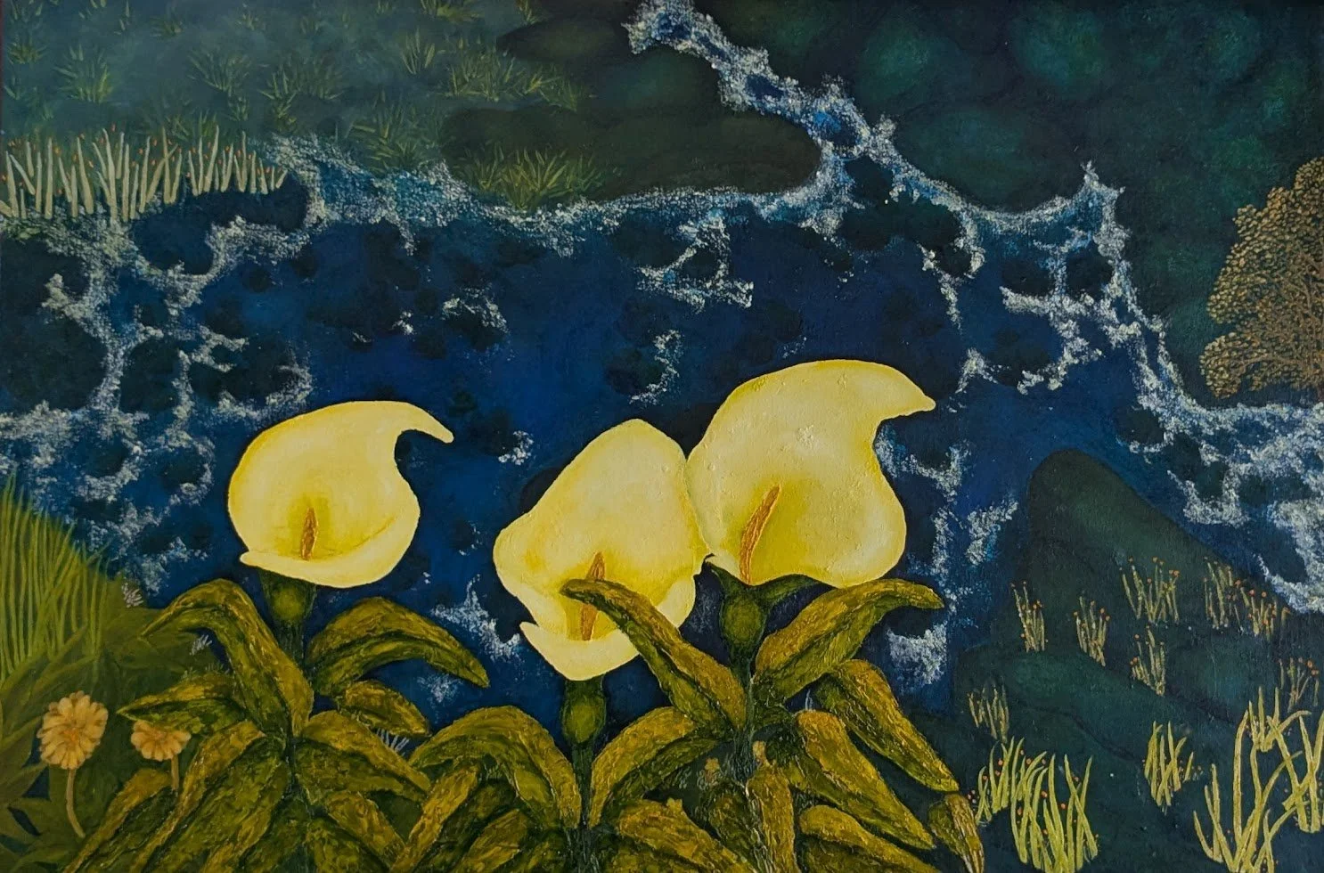 Relocating to Aotearoa in 2013 to care for her parents Cath was once again influenced by her environment creating work that reflected the softer green and yellow hues, in her work.